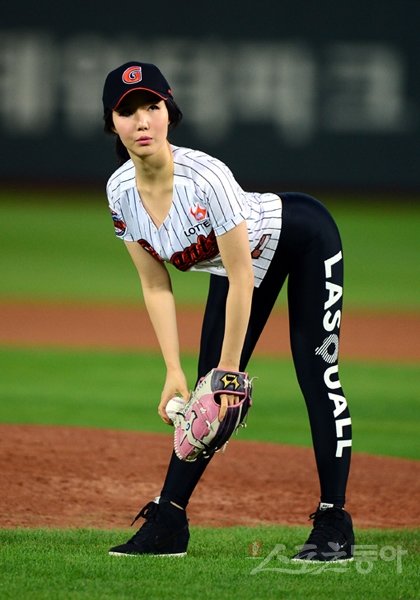 22일 부산 사직야구장에서 '2015 타이어뱅크 KBO리그' 롯데 자이언츠와 두산 베어스의 경기가 열렸다. 트로트가수 정해진이 시구를 준비하고 있다.