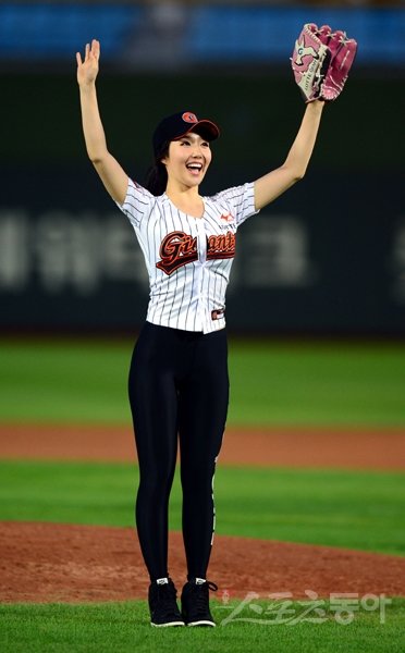 22일 부산 사직야구장에서 '2015 타이어뱅크 KBO리그' 롯데 자이언츠와 두산 베어스의 경기가 열렸다. 트로트가수 정해진이 시구를 던지고난 뒤 환호하고 있다.