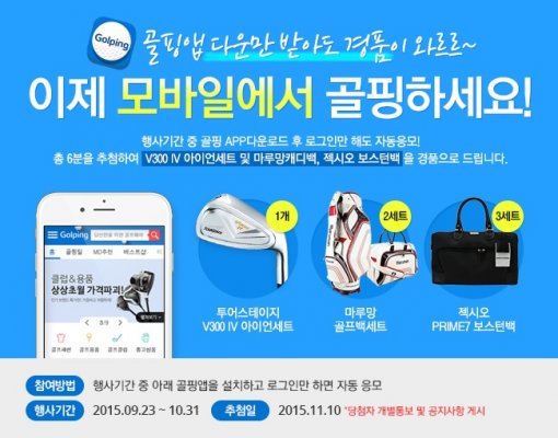 서비스 오픈을 기념해 앱 다운로드 후 로그인한 고객에게는 아이언 세트와 골프백 등 추첨을 통해 푸짐한 상품을 증정한다.
