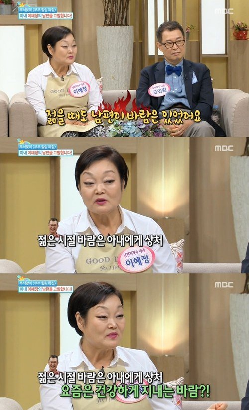 이혜정은 “남편이 젊었을 때 바람이 있었다. 아예 없었던 건 아니다”며 “젊었을 때 났던 바람이 날 마음 아프게 하는 바람이었다면 지금은 날 기분 좋게 만드는 바람이다”고 밝혔다.