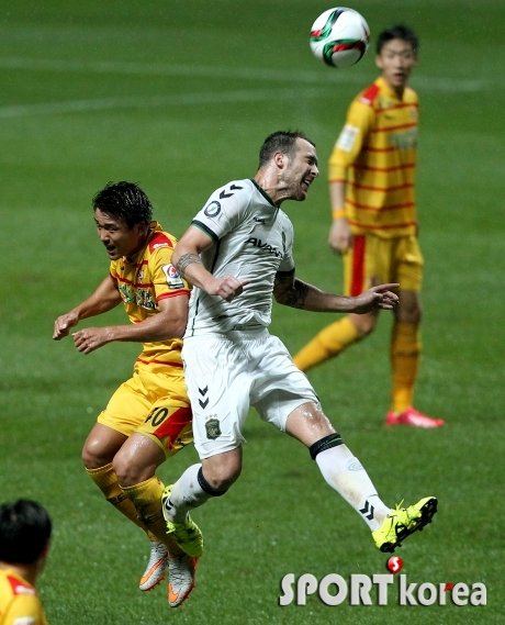 23일 오후 7시 광주월드컵경기장에서 열린 현대오일뱅크 K리그 2015 광주FC 대 전북 현대 모터스 경기 후반 전북 우르코와 현대 이찬동이 공중볼 경합을 벌이고 있다.
