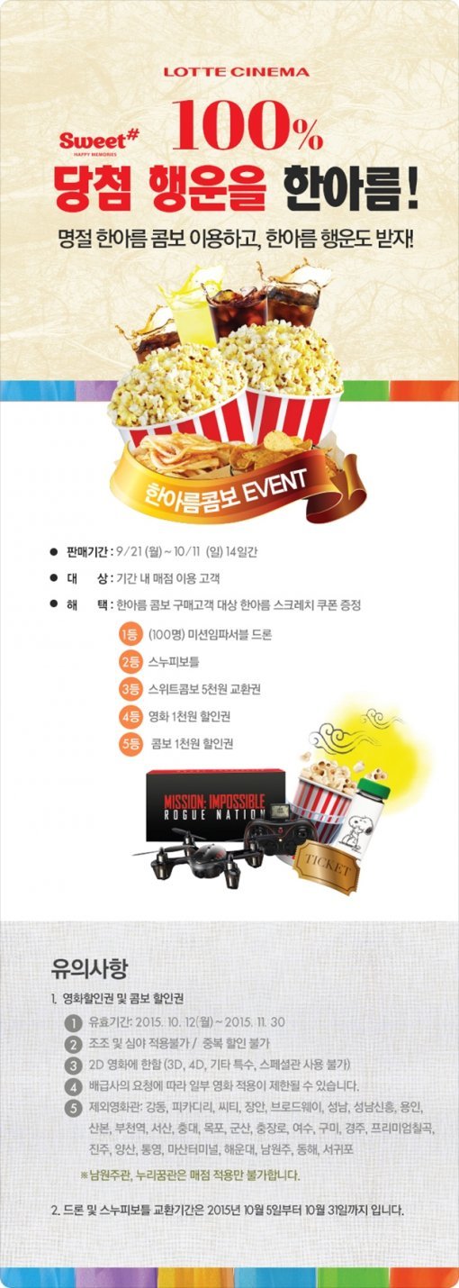 롯데시네마는 온 가족이 모이는 한가위를 맞이하여 추석연휴 전후 기간동안 온 가족이 함께 먹을 수 있는 ‘한아름 콤보’를 구입하는 고객을 대상으로 100% 당첨 이벤트를 준비했다.