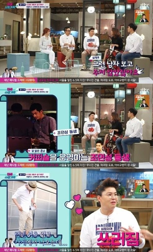 이영자는 “경리단길에서 조인성 동생이 커피숍을 한다. 지나가다 그렇게 입은 조인성 동생이 가게에서 나오는 걸 봤는데 주저앉았다”며 당시를 회상했다.