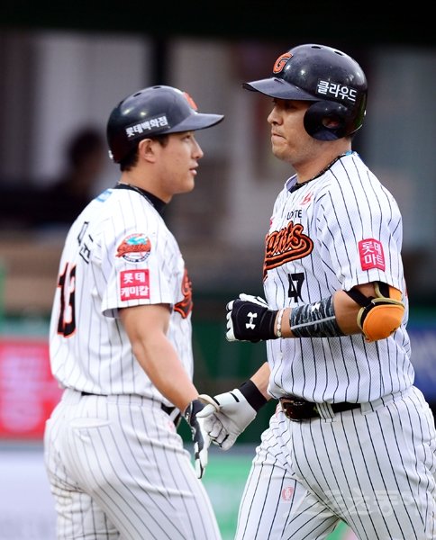 24일 부산 사직야구장에서 '2015 타이어뱅크 KBO리그' 롯데 자이언츠와 두산 베어스의 DH 1차전 경기가 열렸다. 4회말 1사 3루에서 롯데 강민호가 두산 이현호를 상대로 우월 투런 홈런을 쏘아올린 뒤 황재균의 환영을 받고 있다.
