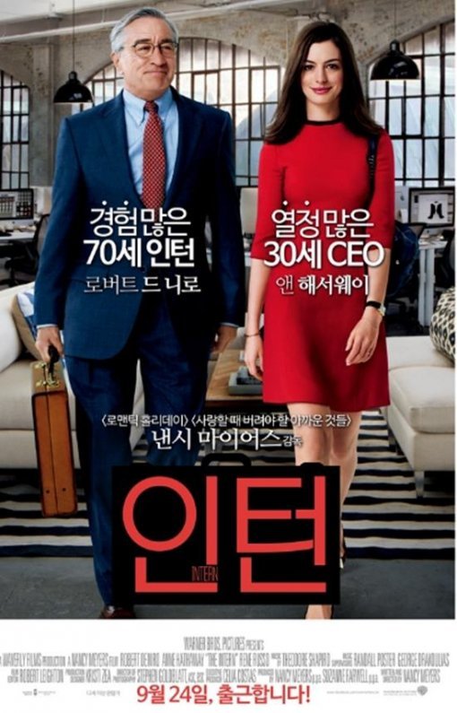 24일 개봉한 ‘인턴’은 창업 1년 반 만에 직원 220명의 성공신화를 이룬 여성 CEO가 수십 년의 직장생활 노하우와 풍부한 인생 경험을 지닌 만능 70세 인턴을 맞이하면서 생기는 에피소드를 다뤘다.