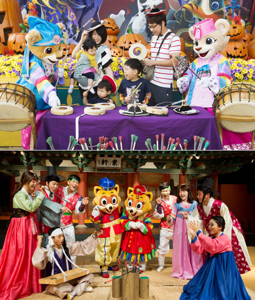 한복을 입은 캐릭터 레니와 라라와 함께 하는 에버랜드 ‘한가위 민속 한마당’(위)과 롯데월드의 3대가 즐기는 ‘행운의 한가위’ 사진제공|에버랜드·롯데월드