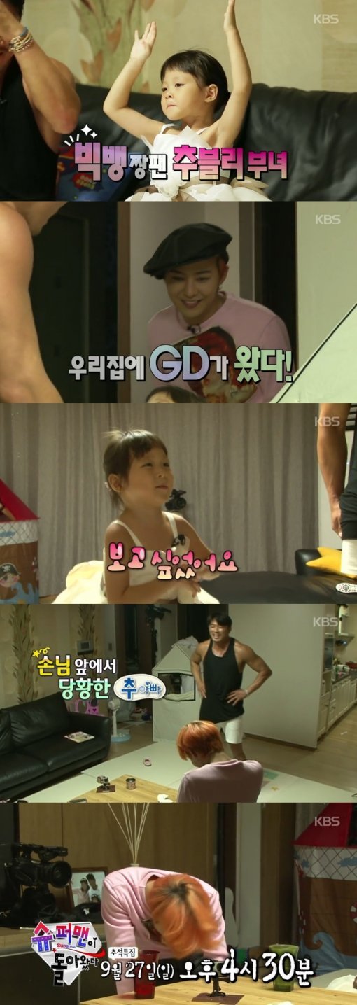 24일 밤 네이버TV캐스트에 공개된 KBS2 ‘슈퍼맨이 돌아왔다’ 97회 예고 영상은 지드래곤이 추사랑의 집을 방문하는 내용을 담고 있다.