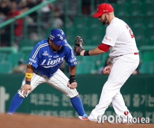 25일 오후 인천 SK행복드림구장에서 열린 `2015 타이어뱅크 KBO 리그 프로야구` SK 와이번스와 삼성 라이온즈의 경기 삼성 6회초 2사 1루에서 1루주자 박석민이 SK 투수 세든의 견제구에 걸려 꼼짝못하고 1루수 브라운에게 태그아웃 되고 있다.