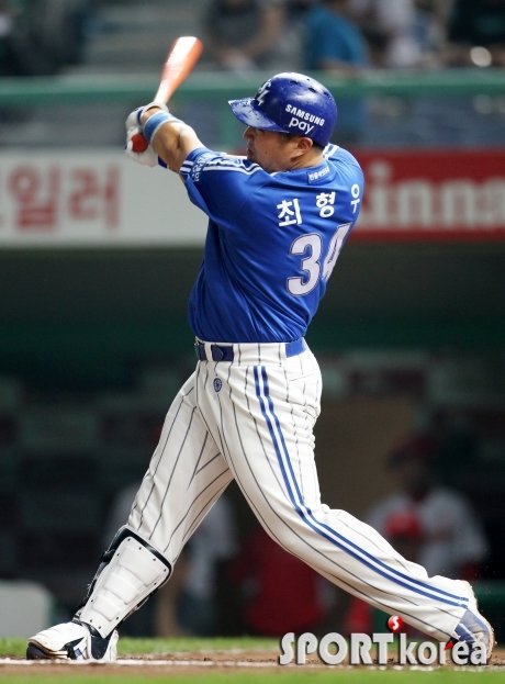 25일 오후 인천 SK행복드림구장에서 열린 `2015 타이어뱅크 KBO 리그 프로야구` SK 와이번스와 삼성 라이온즈의 경기에서 삼성 최형우가 8회초 1사 1,2루에서 추격의 1타점 적시타를 때리고 있다.