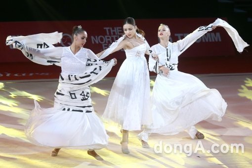 손연재, 알렉산드라 솔다토바, 마르가리타 마문 선수가 26일 오후 서울시 송파구 잠실실내체육관에서 열린 ‘메이킨Q 리드믹올스타즈 2015’에서 멋진 연기를 하고 있다.