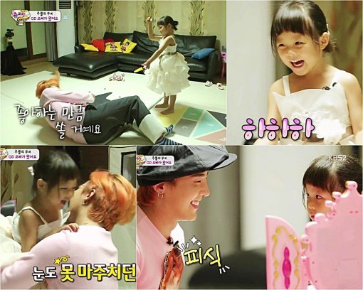 어색한 소꿉놀이를 하던 두 사람. 지드래곤은 어린이 화장대 선물로 사랑이와 한 층 더 가까워질 수 있었다. 특히 사랑이는 평소 좋아하던 지드래곤이 진지하게 화장대를 조립하는 얼굴을 뚫어져라 몰래 쳐다보기도 해 보는 이를 미소짓게 했다.