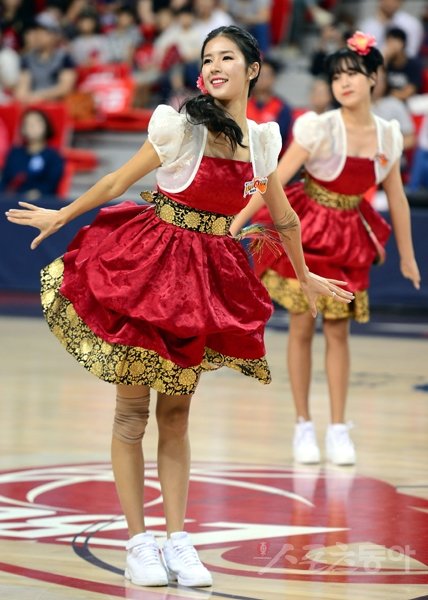 29일 울산 동천체육관에서 열린 '2015-2016 KCC 프로농구' 울산 모비스와 고양 오리온스의 경기에서 치어리더 박기량이 화려한 공연을 선보이고 있다.