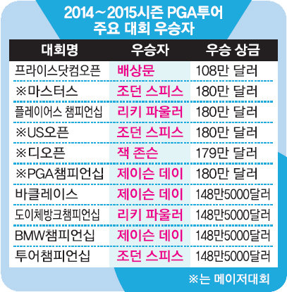 2014∼2015시즌 PGA투어는 조던 스피스의 해라고 해도 과언이 아니다. 스피스가 주목 받기 시작한 건 마스터스부터. 3월 발스파 챔피언십에서 시즌 첫 승을 기록하며 상승세를 탄 뒤 마스터스에서 4라운드 내내 선두를 지킨 끝에 18언더파 270타를 기록하며 그린재킷을 입었다. 21세8개월16일의 나이로 우승해 타이거 우즈(1997년·21세3개월14일)에 이어 마스터스 역사상 두 번째 어린 챔피언으로 기록됐다. 스피스의 상승세는 여기서 끝나지 않았다. 6월 US오픈에서 5언더파 275타를 적어낸 그는 2002년 우즈 이후 6번째 마스터스와 US오픈을 연속 제패한 선수가 됐다. 뿐만 아니라 디오픈 공동 4위, PGA 챔피언십 2위로 4개의 메이저 대회에서 모두 ‘톱5’에 이름을 올리며 생애 처음 세계랭킹 1위로 등극했다.