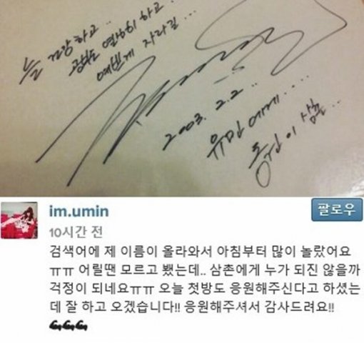 공개된 사진에는 멜로디데이 유민의 삼촌인 배우 장동건의 친필 사인과 메시지가 담겨 있다.