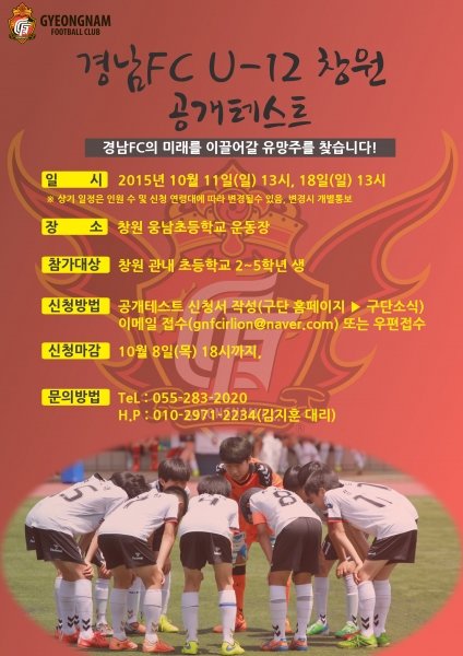 오는 10월 11일(일), 18일(일)에 창원 웅남초등학교 운동장에서 진행되는 U-12 유소년 클럽 공개테스트는 경남FC의 미래 선수 자원을 발굴하기 위한 밑거름이다.