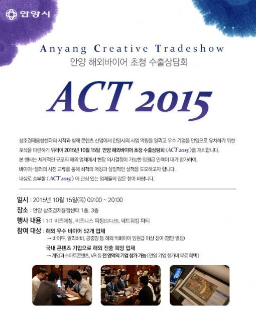 해외의 대형 바이어들이 국산 스마트콘텐츠를 구입하기 위해 한 곳에 모인다. 안양시는 해외시장 진출을 꿈꾸는 회사들을 위한 '안양 수출상담회 2015'(Anyang Creative Tradeshow 2015, 이하 ACT 2015)를 오는 10월 15일 안양 창조경제 융합센터에서 개최한다고 금일(30일) 밝혔다.