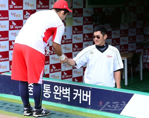 30일 인천 SK행복드림구장에서 '2015 타이어뱅크 KBO리그' SK 와이번스와 LG 트윈스의 경기가 열린다. 경기전 LG 서용빈 코치와 SK 정의윤이 인사를 나누고 있다.