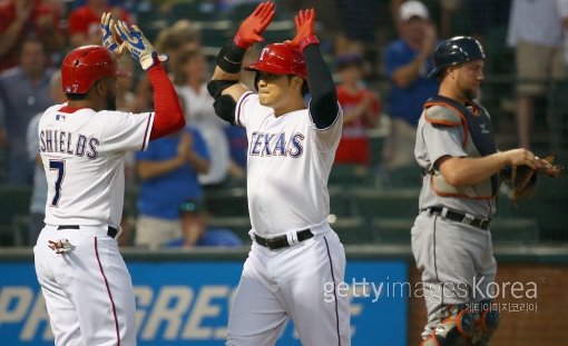 텍사스 추신수(오른쪽)가 30일(한국시간) 글로브 라이프 파크에서 열린 디트로이트와의 홈경기 1회말 무사 1루서 2-2로 균형을 이루는 우월2점홈런을 터트린 뒤 홈에서 선행주자 딜라이노 드실즈의 환영을 받고 있다. 사진=ⓒGettyimages멀티비츠