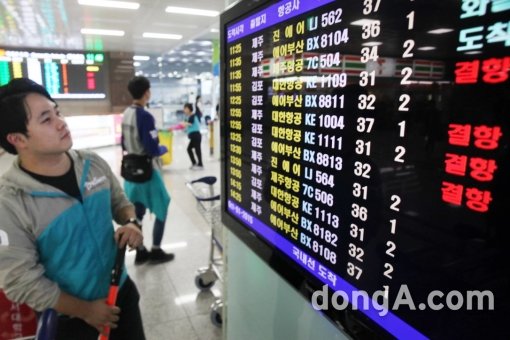 강풍을 동반한 비가 전국적으로 내린 가운데 12일 부산 김해국제공항 국내선 탑승장에 결항 안내문 앞에서 부산국제영화제 자원봉사자들이 관련 내용을 살펴보고 있다.