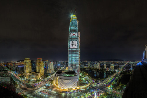 롯데월드타워 운영을 맡고 있는 롯데물산은 벽면에 설치된 태극기에 이은 두 번째 ‘나라사랑 캠페인’으로 캘리그래퍼(글씨 예술가) 강병인씨의 작품 ‘통일로, 내일로’를 설치했다. 가로 42m, 세로 45m로 43층부터 58층까지 총 644개 커튼월(Curtain Wall)에 시공했다. 작품을 설치하기 위해 26일부터 29일까지 추석 연휴 동안 10여 명이 하루 9시간씩 작업했다.