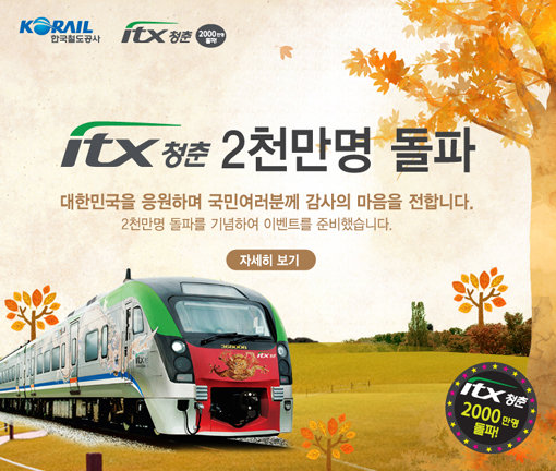 한편 코레일은 ITX-청춘 이용객 2000만 명 돌파를 기념하는 이벤트로 수도권전철 7개 대표역을 방문하는 스탬프 여행 ‘116년 철도역사를 찾아서’와 취업준비생을 대상으로 경춘선 열차여행을 떠나는 ‘청춘을 응원합니다’을 진행한다.