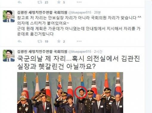 국군의 날 기념식서 野 초선 김광진 의원 자리 배치 해프닝…김관진 실장과 착각?