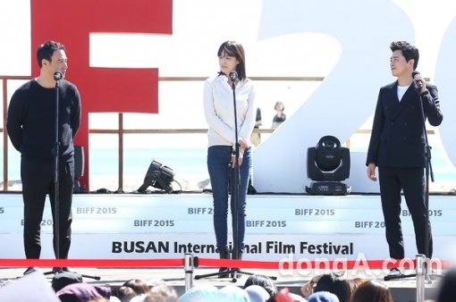 배우 배성우(왼쪽부터), 이하나, 조정석이 2일 오후 부산 해운대 비프빌리지에서 열린 제20회 부산국제영화제 영화 '특종: 량첸살인기' 무대인사에 참석해 인사를 하고 있다.