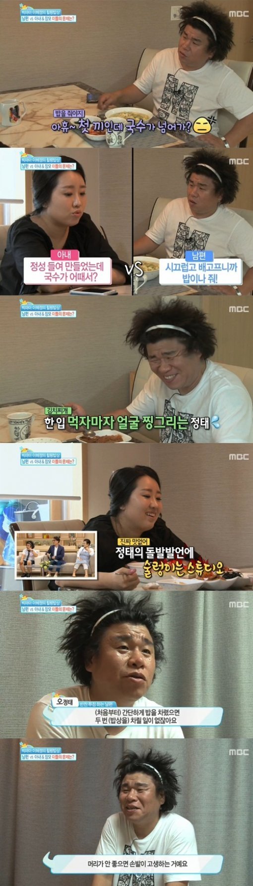 오정태의 아내 백아영은 “애들이 먹던 건 또 안 먹고 본인의 입맛에 맞는 탕, 찌개 있어야 한다. 또 아침에 먹은 것은 점심 때 안 먹는다. 그러니 일을 두 배, 세 배 해야한다. 집에 취직을 한 기분이 든다”고 고충을 토로했다.