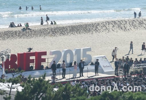 배우 전도연, 김남길, 박성웅이 2일 오후 부산 해운대구 중동 비프빌리지 야외무대에서 열린 영화 '무뢰한'야외 무대인사에 참석하고 있다.