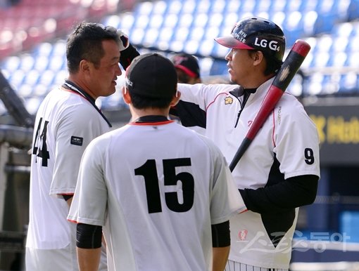 2일 서울 잠실야구장에서 '2015 타이어뱅크 KBO리그' LG 트윈스와 한화 이글스의 경기가 열린다. 경기 전 한화 조인성과 LG 이병규(오른쪽)가 반갑게 인사를 나누고 있다.
