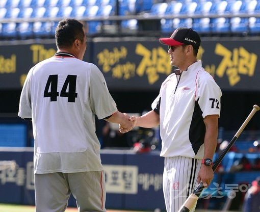 한화 조인성-LG 서용빈 타격코치의 ‘정겨운 악수