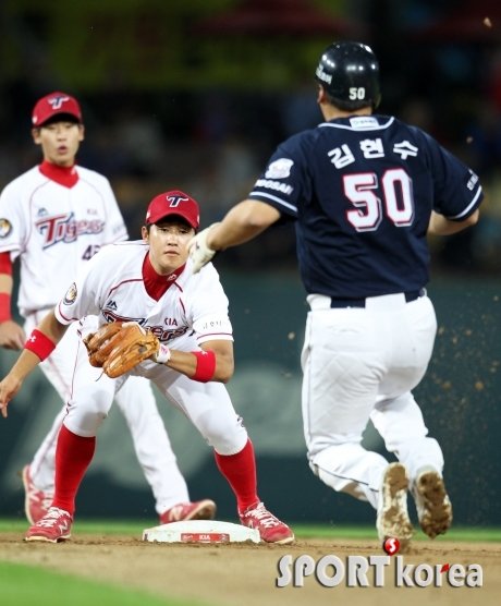 2일 오후 광주-기아챔피언스필드에서 열린 `2015 타이어뱅크 KBO 리그 프로야구` KIA 타이거즈와 두산 베어스의 경기 두산 4회초 1사 1루에서 1루주자 김현수가 5번 양의지 타석 때 견제구에 걸려 2루도루를 시도하다가 KIA 고영우에게 태그아웃 당하고 있다.