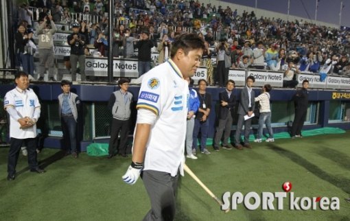 2일 오후 대구 시민야구장에서 열린 `2015 타이어뱅크 KBO 리그 프로야구` 삼성 라이온즈 대 kt 위즈 경기에 앞서 삼성 레전드 양준혁이 시타를 위해 그라운드르 들어서고 있다.