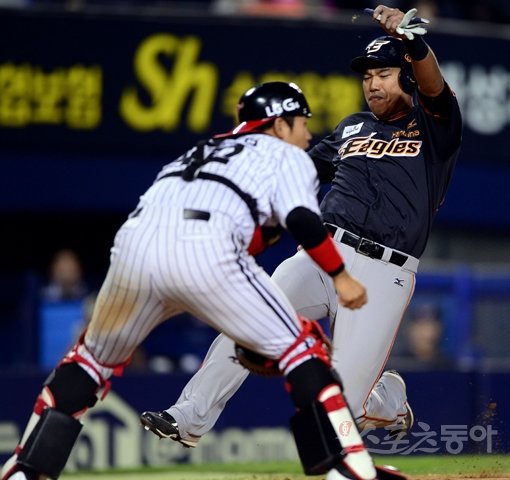 2일 서울 잠실야구장에서 '2015 타이어뱅크 KBO리그' LG 트윈스와 한화 이글스의 경기가 열렸다. 8회초 2사 2루 상황에서 한화 주현상의 적시타 때 2루 주자 최진행이 홈으로 쇄도해 세이프 되고 있다.