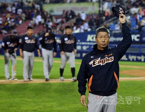 2일 서울 잠실야구장에서 열린 '2015 타이어뱅크 KBO리그' LG 트윈스와 한화 이글스의 경기에서 선발 안영명의 역투와 타선의 집중력을 앞세운 한화가 6-3 승리를 거두며 5위 탈환의 꿈을 버리지 않았다. 경기 후 한화 김성근 감독이 한화 응원단을 향해 모자를 벗으며 인사를 하고 있다.