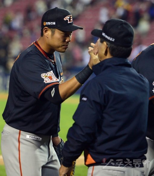 2일 서울 잠실야구장에서 열린 '2015 타이어뱅크 KBO리그' LG 트윈스와 한화 이글스의 경기에서 선발 안영명의 역투와 타선의 집중력을 앞세운 한화가 6-3 승리를 거두며 5위 탈환의 꿈을 버리지 않았다. 경기 후 한화 최진행이 김성근 감독과 하이파이브를 하고 있다.