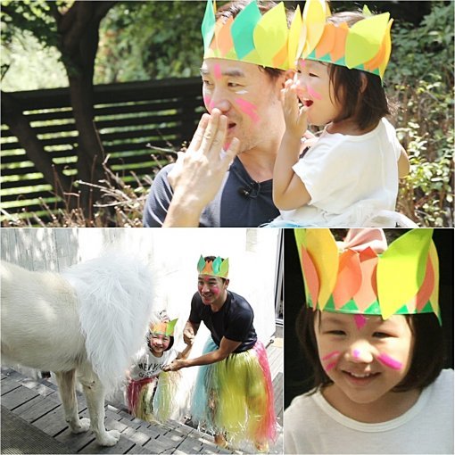 이날 엄태웅은 노끈을 이용해 무언가를 만들기 시작했다. 색깔을 이리저리 맞춰보고 지온의 몸에 직접 대어 보는 등 땀을 뻘뻘 흘리며 서툰 손으로 만든 것은 바로 훌라 치마. 훌라 치마가 완성되자 인디언 왕관까지 금세 만들어내 감탄을 자아냈다. 이어 지온은 엄태웅의 정성이 들어가 있는 훌라 치마와 인디언 왕관을 장착하며 꼬마 인디언 소녀로 변신해 깜찍한 매력을 발산했다.