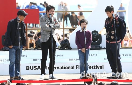 이준익 감독(왼쪽부터), 배우 송강호, 이효제, 유아인이 3일 오후 부산 해운대 비프빌리지에서 열린 영화 ‘사도’ 야외무대인사에 참석해 인사를 하고 있다.