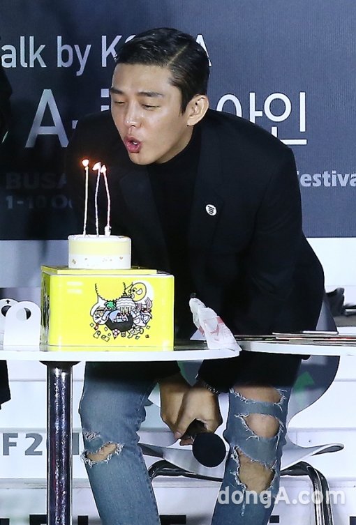 배우 유아인이 3일 오후 부산 해운대 비프빌리지에서 열린 오픈토크에 참석해 생일이벤트를 하고 있다.