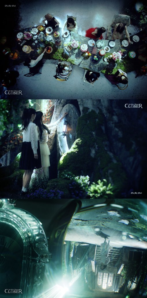 스틸 컷 속에서 오마이걸 멤버들은 어두운 푸른 빛이 맴도는 신비한 분위기에서 만찬을 하는 장면과 나무의 문으로 들어가고 있는 유아와 비니의 모습이 담겨있다.