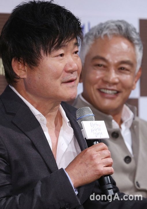 배우 이계인(왼쪽)이 5일 오후 서울 강남구 압구정 한 멀티플렉스관에서 열린 영화 '미안해 사랑해 고마워’ 제작보고회에 참석해 인사말을 하고 있다.