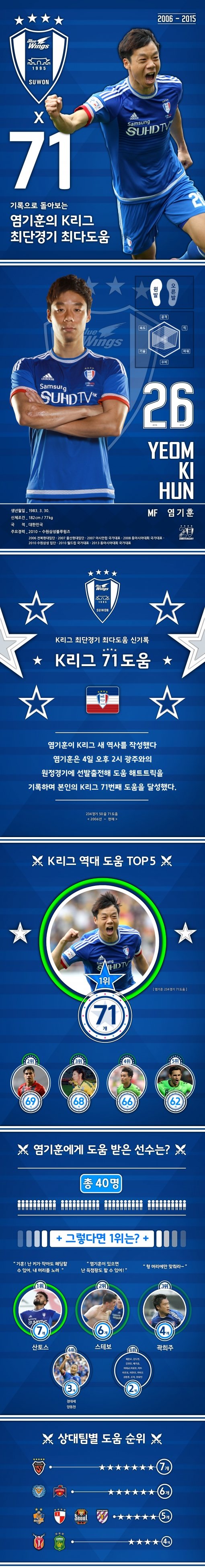 프로 데뷔 년도였던 2006년에 5도움을 기록하며 K리그 신인왕에 등극한 염기훈은 2010년 수원에 이적한 후부터 10도움을 기록하며 본격적인 도움행진을 시작했다. 2011년에는 14도움, 2013년에는 12도움을 기록했으며 2014년에는 8도움으로 잠시 주춤했지만 올해는 아직 시즌 진행 중임에도 불구하고 본인의 프로 데뷔 후 최다 도움인 15도움을 기록하며 ‘제2의 전성기’를 누리고 있다.