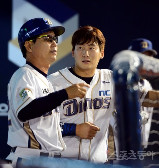 5일 창원 마산야구장에서 '2015 타이어뱅크 KBO리그' NC 다이노스와 kt 위즈의 경기가 열렸다. 5회초 이닝을 마친 후 NC 나성범이 전준호 코치(왼쪽)와 대화를 나누고 있다.
