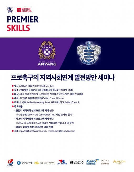 아울러 21일에는 FC안양의 연고지인 안양 롯데백화점 평촌점 문화홀에서 약 200여명의 청중과 함께 FC안양과 QPR의 지역사회 연계 활동을 사례로 심도 있게 소개하고, 청중과의 토론 및 질의응답을 통해 효과적인 지역사회연계형 프로그램을 구상할 수 있는 아이디어를 공유하는 세미나가 진행된다.