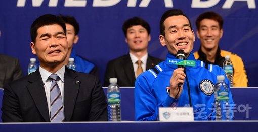 삼성화재 임도헌 감독(왼쪽)과 고희진이 6일 서울 강남구 리베라호텔에서 열린 ‘NH농협 2015~2016 V리그’ 남자부 미디어데이에서 취재진의 질문에 웃으며 답하고 있다. 김종원 기자 won@donga.com