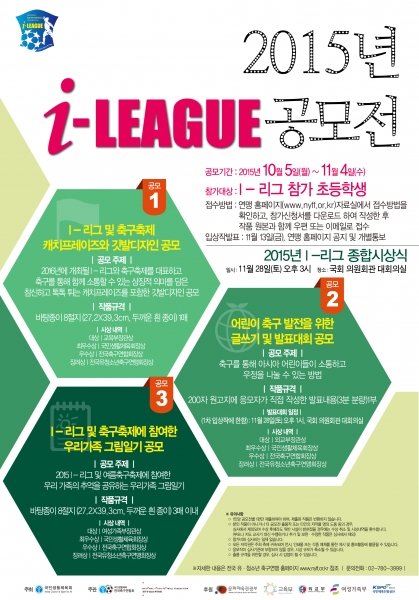 올해로 3회째 맞는 I-리그 공모전은 △캐치프레이즈 및 깃발디자인 △그림일기 △글쓰기 및 발표대회 등 총 3개 부문이며, 2015년 10월 5일부터 11월 4일까지 한 달간 개최된다. 매년 공모전에 참여하는 학생들이 늘어가는 등 큰 호응을 얻고 있으며, 올해도 많은 참여가 예상되고 있다.