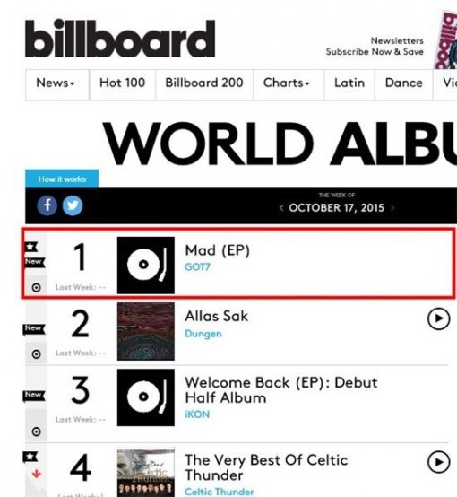 갓세븐 미니앨범 ‘매드(MAD)’가 미국 빌보드 월드 앨범 차트1위에 올랐다.