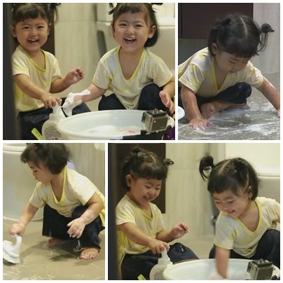엄마 슈가 라희, 라율이에게 인형 목욕을 맡겨놓고 잠시 자리를 비운 사이 라둥이는 인형을 저 멀리 버려두고 손 세정제 용기를 가지고 노는 데에 빠졌다. 용기에서 거품이 나오는 것에 재미를 붙인 라둥이는 웃음을 터트리며 즐거운 시간을 보냈다.