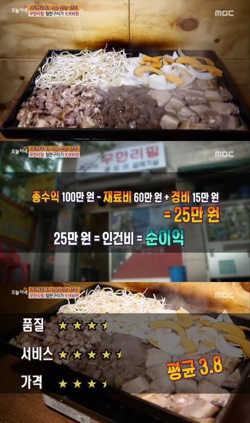 7일 방송된 ‘생방송오늘저녁’의 ‘가격타파! 이유 있는 맛집’ 코너에서는 무한리필 철판구이를 9900원에 판매하는 음식점을 소개했다.