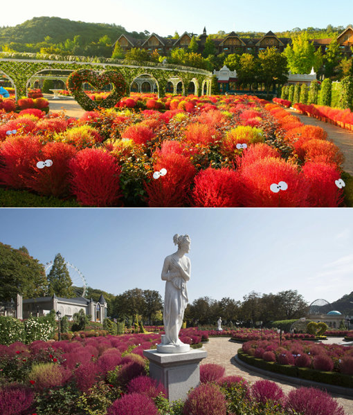 에버랜드 장미원을 화사한 붉은색으로 수놓은 코키아들. 가을이면 다른 식물들보다 일찍, 그리고 더 선명하게 붉은색으로 변하는 특성을 갖고 있는 코키아가 가을 조경축제의 새로운 주인공으로 변신해 관람객을 맞고 있다. 사진제공|에버랜드